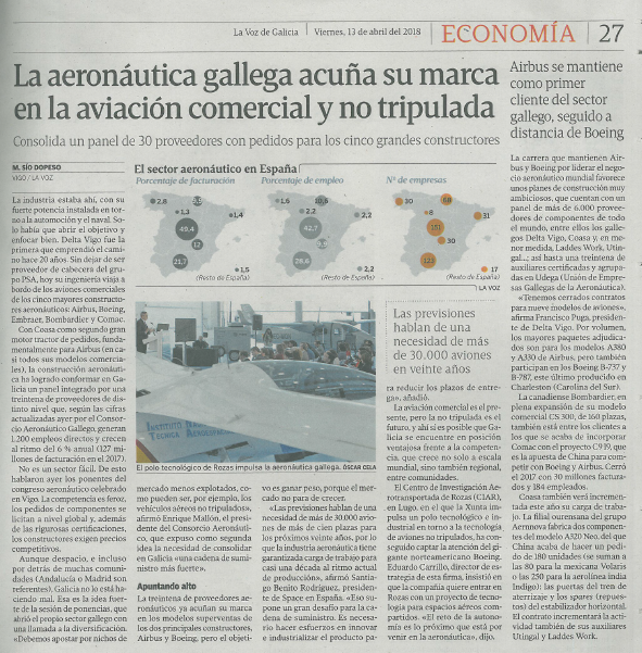La carrera que mantienen Airbus y Boeing por liderar el negocio aeronáutico mundial favorece unos planes de construcción muy ambiciosos, que cuentan con un panel de más de 6.000 proveedores de componentes de todo el mundo, entre ellos los gallegos Delta Vigo, Coasa y, en menor medida, Laddes Work, Utingal…; así hasta una treintena de auxiliares certificadas y agrupadas en Udega (Unión de Empresas Gallegas de la Aeronáutica).